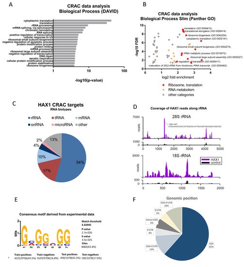 Identification of HAX1-associated RNA targets by CRAC analysis (HEK293 cells). (A) Functional annotation enrichment of HAX1 target genes (results from the pooled N- and C-tagged protein approach). Enriched gene ontology terms (DAVID: Biological Process) presented in bar plot, the length of each bar corresponds to statistical significance of the enrichment (−log10 p-value). The top 20 terms are presented for each category. (B) Enriched Biological Process terms (Panther GO) plotted with fold enrichment (log2) against false discovery rate (−log10). The most reliable results are in the upper right corner. Terms associated with ribosome biogenesis, rRNA processing, and translation are marked red. Terms associated with RNA metabolism (other than rRNA) are marked in light orange. Detailed description of GO terms in Supplemental Data File S2. (C) Distribution of RNA species in HAX1 targets. (D) Coverage of HAX1 CRAC reads along small (18S) and large (28S) ribosomal subunits. Reads for negative control shown below. (E) Consensus motif identified by STREME in the HAX1-targets dataset (combined experimental data from C- and N-tagged HAX1). The E-value is the p-value multiplied by the number of motifs reported by STREME. (F) Genomic position of HAX1 binding in CRAC-identified targets (269 targets overlapping in C- and N-tagged datasets) established using UCSC Genome Browser on Human Feb. 2009 (GRCh37/hg19) Assembly.