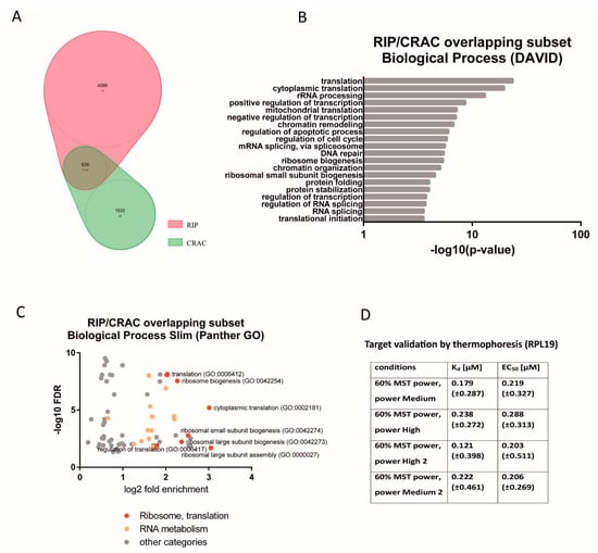 Characterization of the overlapping CRAC–RIP subset of HAX1 mRNA targets. (A) Overlapping targets in RIP and CRAC_C (629 mRNAs) represent, respectively, 13.7% and 38.5% of the overall results. Hypergeometric test for these overlap gives p-values of 9.8e–42 (total gene set: 15220). (B) Functional annotation enrichment of the RIP/CRAC overlap of HAX1 target genes (DAVID, top 20 terms) maintains a high enrichment in terms associated with translation, RNA and rRNA processing, and ribosome biogenesis (Biological Process) (C) Enriched Biological Process terms found for the overlap subset (Panther GO) plotted with fold enrichment (log2) against false discovery rate (−log10) reveal that terms associated with translation and ribosome biogenesis are the most probable. (D) Target validation by microscale thermophoresis (MST) performed for the RPL19 in vitro transcript (sense). From 33 transcripts encoding ribosomal proteins present in the overlapping RIP/CRAC target list, a fragment of the RPL19 coding sequence was selected for validation. The interaction with purified and the fluorescently labeled HAX1 protein was confirmed in 4 independent measurements by thermophoresis under different conditions (MST power medium to high). For each measurement, the dissociation constant (Kd) and half maximal effective concentration (EC50) were assigned. No interaction was observed with antisense transcript (negative control).