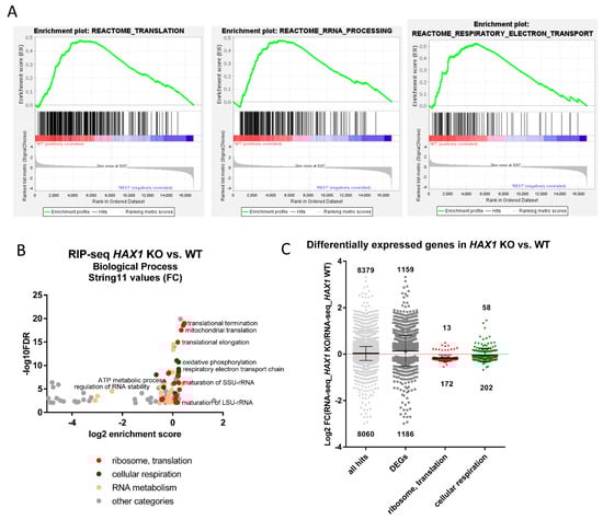 Interestingly, HAX1 binding seems to be limited to transcripts linked to translation/ribosome biogenesis and includes far fewer transcripts linked to the oxidative phosphorylation/respiratory electron chain, which were also significantly downregulated in HAX1 KO, indicating a different mode of regulation for this other group of transcripts. Furthermore, mRNA RIP targets (RIP target subset) along with their respective FCs in RNA-seq were analyzed in weighted analysis (String 11, values, Biological Process), separately for the downregulated and upregulated transcripts, revealing an enrichment in ribosome biogenesis and rRNA processing (GO:0042254 and GO:0006364) for the group of downregulated transcripts, while the same analysis of the upregulated group did not reveal any enrichment (Figure 7C).