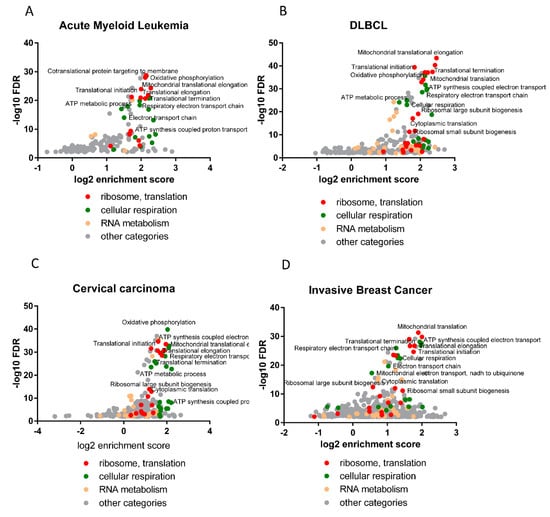 Coexpression analysis was performed using cBioPortal for Cancer Genomics with TCGA data (The Cancer Genome Atlas, PanCancer Atlas) for the four neoplasms (Cervical Cancer—297 patients, Breast Cancer—1084 patients, Acute Myeloid Leukemia—200 patients, and Diffuse Large B-cell Lymphoma—48 patients). Gene lists with Spearman rank correlation coefficients were used in the String 11 gene ontology analysis (with Spearman coefficients as values/ranks) and the obtained Biological Process terms were plotted in Figure 6A–D, showing that the terms with the highest enrichment and the lowest false discovery rate are similar to the expression profiling obtained in HL-60 cells (RNA-seq). The most enriched and probable terms revealed by the weighted analysis of the genes whose expression significantly correlates with HAX1 expression included those involved in translation (cotranslational protein targeting to membrane, mitochondrial translation, translational elongation, translational initiation, cytoplasmic translation), ribosome assembly, and rRNA processing, but also energy generation in mitochondria (respiratory electron transport chain, oxidative phosphorylation, cellular respiration), and RNA processing in general. These enrichments were observed in all neoplasms analyzed. For details, see the Supplementary Data File S5.