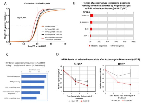 The RNA-seq fold change (RNA-seq_HAX1_KO/RNA-seq_WT) distributions of the transcripts representing the HAX1 targets (RIP target subset) and the rest of the transcripts (non-RIP target subset) were compared (Figure 7A), showing that the changes in the distribution towards the downregulation of the RIP-associated transcripts in HAX1 KO increase with the increasing probability of the HAX1-specific RNA interaction (lower FDR), suggesting that the RIP targets are less stable. The effect, although statistically significant, is not ubiquitous and does not affect all RIP targets equally, suggesting some other layers of regulation. Distribution analysis performed only for transcripts involved in ribosome biogenesis (red line) shows a much more substantial shift toward lower FC values (log2[RNA-seq_HAX1_KO/RNA-seq_WT]). Furthermore, the fraction of transcripts involved in ribosome biogenesis increases when the RIP results are analyzed with the same FDR cut-offs in the weighted analysis (String 11, Biological Process) with FC from RNA-seq as values (Figure 7B).