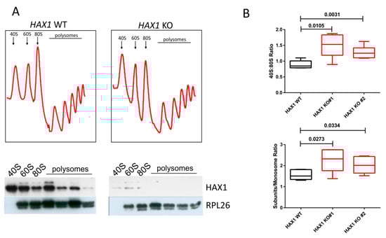 To assess the physiological effect of HAX1 deficiency in the context of ribosome biogenesis, ribosome sedimentation in the sucrose density gradient was performed for HAX1 WT and HAX1 KO HL-60 cells. The ribosomal P/M (polysome-to-monosome) stoichiometry ratio did not reveal significant changes between the WT and KO cell lines, but the 40S to 80S ratio revealed that the peak corresponding to the small subunit increases in HAX1 KO compared to WT (Figure 8A,B). The overall subunits:monosome ratio (40S + 60S:80S) is also significantly increased in HAX1 KO compared to WT (Figure 8B).
