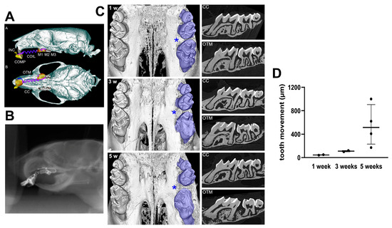 The orthodontic tooth movement (OTM) treatment is the alignment of displaced teeth, eliminating malocclusions and inadequate loading of the periodontium. The periodontium is essential for supporting the functionality of the tooth, composed of diverse of mineralized and non-mineralized tissues such as cementum, periodontal ligament (PDL) and alveolar bone [1]. OTM is a process initiated by sterile inflammation and orthodontic force which induces periodontal bone remodeling [2]. The sterile inflammation is a reaction to mechanical stimulation where the local tissue induces an inflammatory response (i.e., synthesis of pro-inflammatory mediators including enzymes, cytokines and chemokines) in order to initiate local tissue remodeling [3,4,5,6]. During OTM, the teeth are loaded with a specific mechanical force whose vector points in the direction of the desired tooth movement [7]. This mechanical force triggers stress/strain distribution in the periodontal ligament (PDL), causing local hypoxia and fluid flow and initiating a sterile inflammatory cascade enabling bone remodeling. PDL fibroblasts play a unique and dominant role in the regulation of bone remodeling during OTM [8]. Bone resorption occurs on the compression side with resorption of the alveolar bone and degradation of the periodontal ligament, while new bone is formed on the tension side with stretching of the periodontal ligament inducing bone apposition and alignment of the Sharpey fibers [9,10,11,12]. Although there are various animal models in orthodontic research trying to explain molecular and cellular mechanisms of OTM, no longitudinal animal studies with continuous periodontal remodeling using in vivo monitoring have been performed so far.