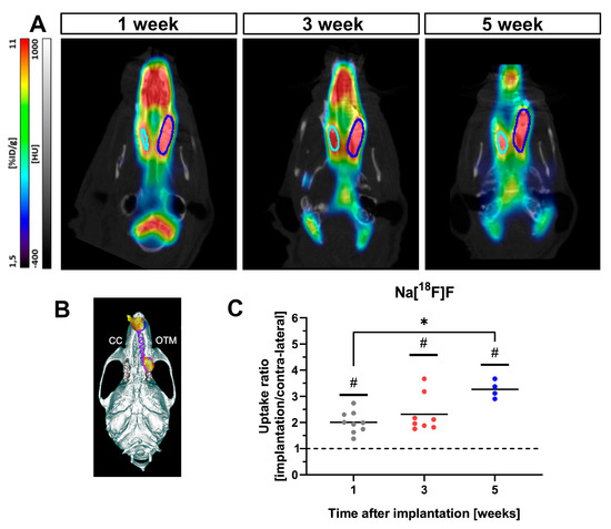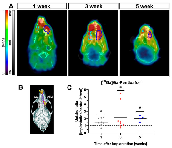 [68Ga]Ga-Pentixafor uptake increases in the early and late phase of OTM. (A) A constant uptake of [68Ga]Ga-Pentixafor was observed during the 5-week trial, suggesting a persisting presence of inflammation. The deep-blue contour represents the region of interest taken for the OTM side, while the turquoise one represents the contralateral side of the jaw, which was taken as a control. (B) OTM and control (CC) sides as revealed by the 3D rendering of the CT scan. (C) Significant differences of the uptake ratio were compared to 1 in the 1st and 5th weeks; the 3rd week also showed a significant difference compared to 1 as a result of the two animals with a TBR > 4. There are no differences of the TBR between the scanning weeks, suggesting a constantly increased uptake. #: statistically significant difference compared to 1.0.