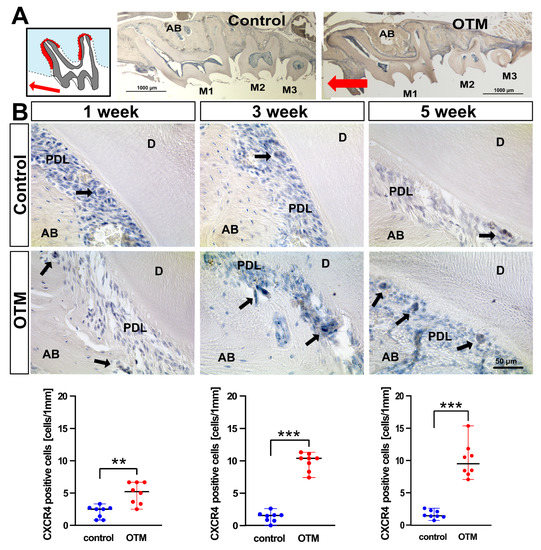 CXCR4-positive cells were quantified on compression zones of M1 distal roots on OTM with the contralateral jaw side (CC) as a control. Compared to the CC, a significant increase of CXCR4-positive cells on periodontal ligament in OTM side with a NiTi coil spring was detected at all time points (1 week, p = 0.0023; 3 weeks, p < 0.0002; and 5 weeks, p = 0.0002) (Figure 4).
