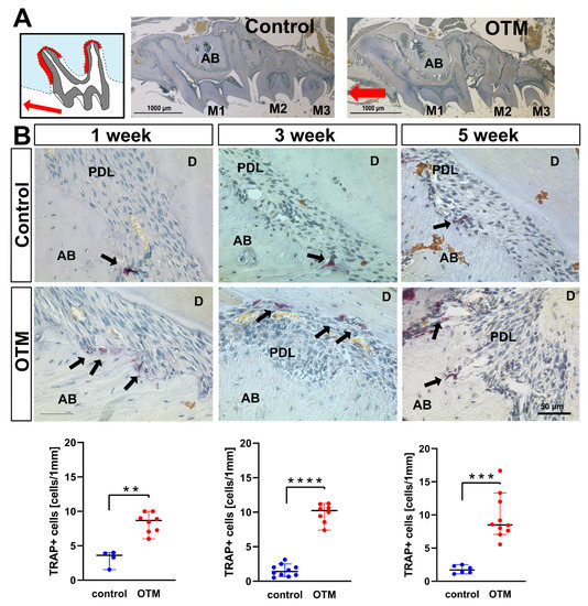 Increase of TRAP-positive cells corresponding to osteoclastogenesis at the OTM side with NiTi coil spring compared to the untreated contralateral jaw side. (A) Schematic picture of compression zones’ M1 distal roots (red) and overview pictures of sagittal sections of maxillary mice, contralateral control side and orthodontic tooth movement (OTM) side. (B) Focusing on the compression zones of M1 distal roots, the number of TRAP-positive osteoclast/odontoclast-like cells (black arrows) was counted on the OTM side and CC. On CC sides the baseline number of TRAP-positive cells is not significantly different, while on the OTM side, it exhibits a significant increase at all time points (** p < 0.01, **** p < 0.0001, and *** p < 0.001, respectively). Two micrographs of molars were randomly selected from at least two animals for histological analysis.