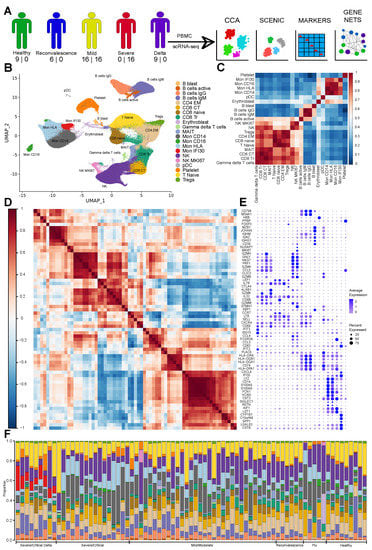 (A) Schematic diagram showing assays performed on the PBMC of COVID-19 patients with numbers of newly sequenced and publicly available samples (shown as number in corresponding order). The diagram shows performed computational analysis regarding computational data integration made with Seurat CCA and SCENIC, identification of marker genes, and computational reconstruction of the Gene Regulatory Network. (B) UMAP with identified cell types. (C) Cell–cell correlation heatmap based on Pearson correlation of the average expression of highly variable genes depicting across cell types similarity. (D) Gene expression Pearson correlation heatmap indicating formed gene modules by marker genes. (E) Dot plot with the expression of marker genes for each cell type ordered according to the correlation on the (C), and gene ordered based on (D). Three plots (C–E) allow joint view highlighting similarity based on activity level of marker genes and cell type closeness as follows from the average expression correlation of highly variable genes. (F) Stacked bar plot with cell type fractions for each sample colored according to the pallet of UMAP. We identified clearly visible Mon IFI30 cells fraction in the samples with Delta variant.