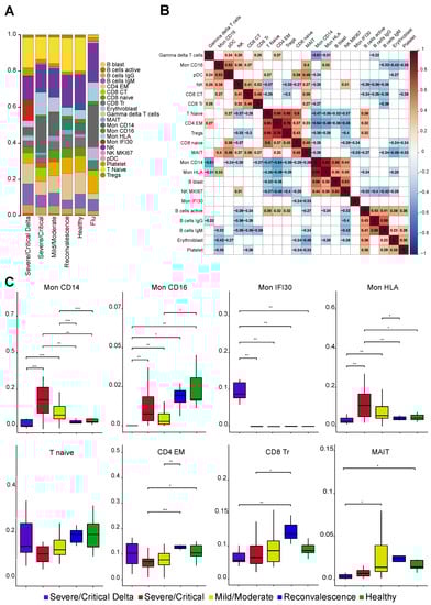 Host–pathogen immune responses during viral infections are usually associated with cellular and molecular shifts in the fractions of the immune cell (Figure 2A,B). To investigate the effect and immunological mechanisms of the COVID-19, we revealed pronounced changes of cell type composition depending on the severity of symptoms and virus variant. Interestingly, we found a strong decrease of the MAIT and CD8 Tr proportions coaligned with the disease severity. A decrease in the MAIT level has been previously associated with poor disease outcomes [,]. Reduction of the CD8 Tr cells probably reflects the accelerated transition of the less specialized CD8 Tr cells to the CD8 CT upon viral antigenic stimulation in the specific cytokine environment. Overall, changes in the lymphoid compartment affect CD8 and MAIT cell populations indicating strong displacement in the cellular immune responses in COVID-19 and identified deeper impairment of the cell composition in the cases with the Delta variant.