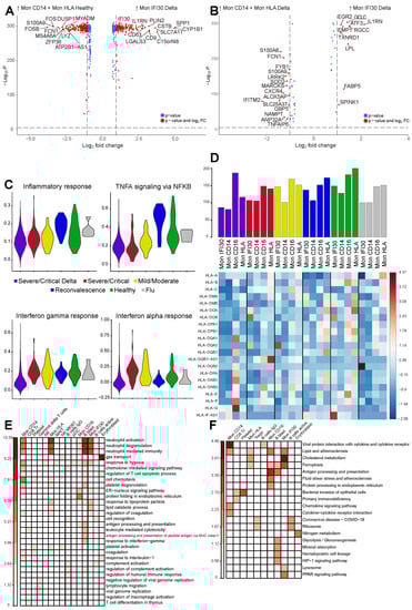 (A) Volcano plot showing gene expression changes between Mon IFI30 from severe Delta samples contrasted with Mon CD14 and Mon HLA from healthy groups because Mon IFI30 is enriched only in the severe Delta COVID-19. Only top significant markers with absolute logFC > 0.75 are highlighted. (B) Volcano plot showing gene expression aspects specific for Mon IFI30 contrasted with Mon CD14 and Mon HLA inside Delta samples and indicating gene activity heterogeneity in the myeloid PBMC group due to severe Delta COVID-19. Only top significant markers with absolute logFC > 0.75 are highlighted. (C) Violin plot with module scores for Inflammatory, TNF alpha, Interferon-gamma, and Interferon-alpha signatures for Mon IFI30 cells across study groups. (D) Heatmap with expression (z-score) of the HLA genes in monocytes across study groups. Bar plot with the summed expression of the HLA genes within a cell type in each cohorte. (E) Heatmap with enrichment of the Biological Processes and (F) KEGG pathways enriched in a set of upregulated (p.adj < 0.05, logFC > 1.5) genes obtained in a pairwise cell subtype comparison between severe Delta and Wuhan-like samples.