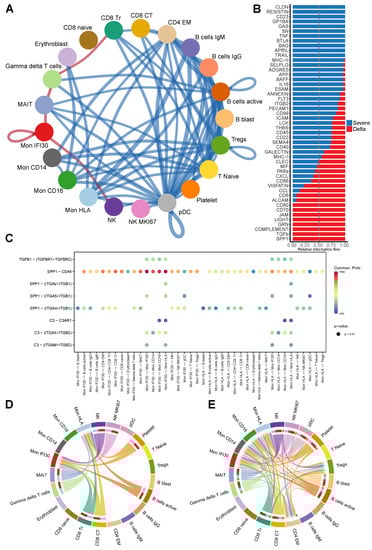 (A) Circle plot showing predicted differential cell–cell communications between severe Delta and Wuhan-like groups (red for gained, and blue for lost in Delta cases). We identified several newly gained communications for the Delta cohort established by Mon IFI30 with MAIT and NK cells and by gdT-cells with MAIT and CD8 Tr cells. (B) Bar plot showing the intensity of context-specific signaling pathways measured as relative information flow as implemented in CellChat. TGF beta and SPP1 are predicted as main signaling molecules involved in cell–cell communication for severe Delta COVID-19 aside from Resistin, CD23, and Caledon. (C) Dot plot showing cell pairs (x-axis) and predicted interacting ligand–receptors (y-axis) for SPP1, TGF beta, and complement pathways. Color on the dot plot shows the strength of a given ligand–receptor interaction quantitatively represented by a probability value obtained with CellChat and calculated based on the law of mass action relying on the average expression of the ligand in a cell group and receptor by another cell group. (D) Chord diagram showing interacting cell types in severe samples via CCL-CXCL axis for severe Wuhan-like samples. (E) Chord diagram showing interacting cell types via CCL-CXCL axis for severe Delta samples.