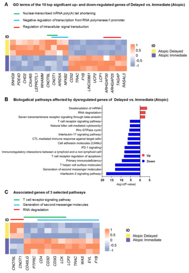Biological processes and pathways affected by the differentially expressed genes in immediately processed CD4+ T-cells from atopic versus healthy subjects. (A) Heatmap depicting the top 10 significant up- and down-regulated genes of delayed versus immediately processed CD4+ T-cells from atopic subjects alongside their associated biological processes (GO Terms). (B) Biological pathways affected by up- and down-regulated genes of the previous comparison using a significance cut-off of p < 0.05, and (C) heatmap showing three selected biological pathways (indicated by colored lines) and their associated genes.
