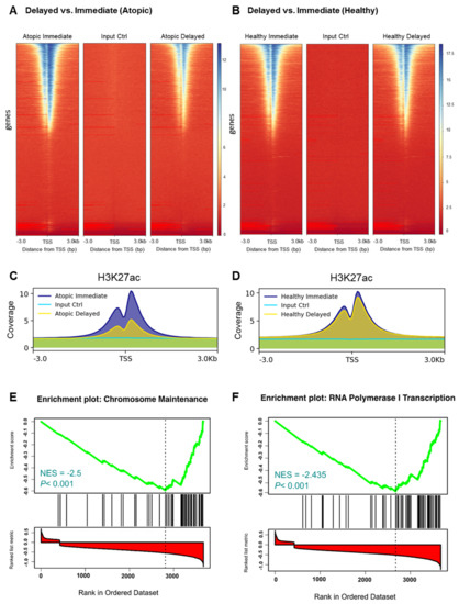 Selective histone modification changes within immediately versus delayed processed CD4+ T-cells from atopic subjects. (A,B) Genomic heatmaps visualizing H3K27 acetylation ChIP-Seq analyses scores associated with genomic regions of 3 kilobases (kb) around the gene transcription start site (TSS) and (C,D) average enrichments over all genomic regions of immediately and delayed processed blood-derived CD4+ T-cells from atopic (A,C) and healthy (B,D) subjects. (E,F) Gene set enrichment analysis (GSEA) of downregulated genes in delayed versus immediately processed blood-derived CD4+ T-cells from atopic subjects.