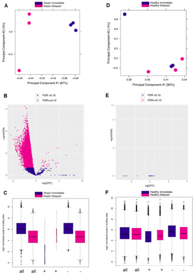 DiffBind analysis of called peaks of H3K27 acetylation ChIP-Seq analysis in delayed versus immediately processed blood-derived CD4+ T-cells of atopic and healthy subjects. (A) PCA plot showing the distance between samples based on the called peaks of delayed vs. immediate (atopic) comparison. (B) Volcano plot showing the differentially called peaks of the previous comparison (significance cut-off at FDR < 0.1). (C) Box plots of read distributions for significantly differentially called peaks of the previous comparison (binding affinity) for all sites (all), sites with increased affinity in the atopic delayed (+), and sites with increased affinity the atopic immediate (−) condition. (D–F) This is the same as the previous description for delayed vs. immediate (healthy) comparison.