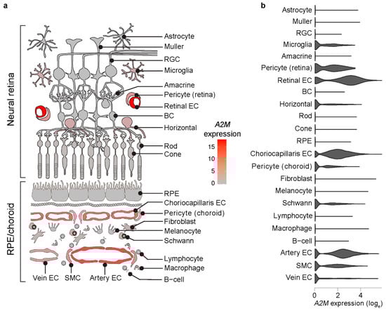 Enrichment of A2M expression in human choroidal and retinal ECs assessed by scRNAseq. Cartoon heatmap (a) and violin plots (b) depicting A2M expression across human RPE/choroid and retinal cells. RGC, retinal ganglion cell; BC, bipolar cell; RPE, retinal pigment epithelium; SMC, smooth muscle cell.
