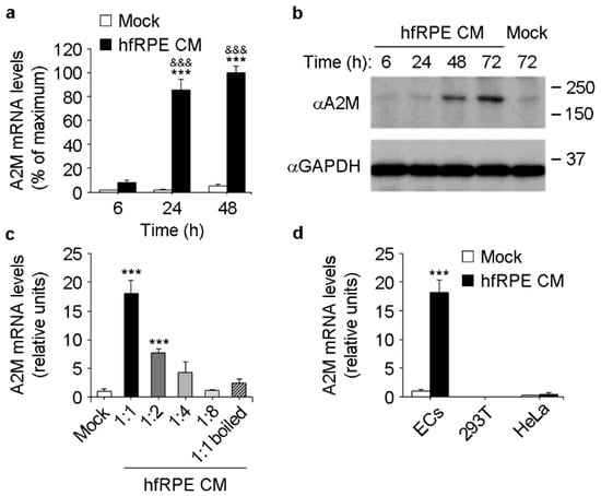 RPE conditioned medium induces A2M expression specifically in ECs. (a) Real-time PCR showing A2M mRNA levels in ECs after incubation with mock or hfRPE basolateral conditioned media (CM) for different times (n = 3, ANOVA). ***, mock vs. hfRPE at each time point; &&&, 24 h and 48 h hfRPE vs. 6 h hfRPE. (b) Representative Western blots (n = 3) showing A2M and GAPDH levels in culture supernatants and lysates, respectively, of ECs after incubation with mock or hfRPE basolateral conditioned media for different times. (c) Real-time PCR showing a dose-dependent effect of hfRPE basolateral conditioned media on A2M expression in ECs 24 h after induction. Numbers on the X-axis indicate the dilution factor. Note that A2M induction was impaired after heat denaturation (1:1 boiled) of the undiluted hfRPE conditioned media (n = 3, ANOVA). ***, 1:1 and 1:2 vs. mock. (d) Real-time PCR showing that induction of A2M expression by hfRPE basolateral conditioned media (24 h incubation) is specific for ECs (n = 3, t-test). ***, mock vs. hfRPE.