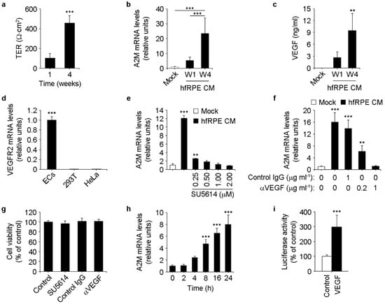 To directly study whether RPE-secreted VEGF-A induces A2M expression in ECs, we carried out experiments using inhibitors of the VEGF-A pathway. We incubated ECs with RPE conditioned media in the absence or presence of either the VEGFR2 inhibitor SU5614 or a VEGF-A blocking antibody, and assessed A2M expression in ECs by real-time PCR. Both treatments abolished the induction of A2M expression in a dose-dependent manner (Figure 3e,f) without compromising cell viability (Figure 3g). Moreover, we observed that recombinant VEGF-A was sufficient to induce A2M expression in ECs (Figure 3h) and to increase the transcriptional activity of human A2M promoter [] in ECs transiently transfected with a luciferase-based reporter plasmid (Figure 3i). Collectively, these results demonstrate the key role of VEGF-A in RPE-mediated paracrine induction of A2M expression in ECs.