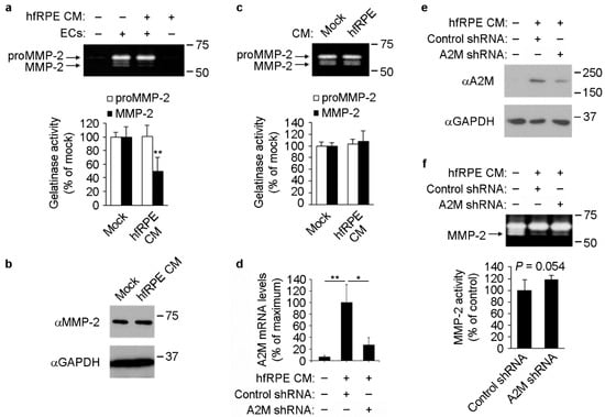A2M-dependent inhibition of MMP-2 activity in supernatants of ECs incubated with hfRPE conditioned medium. (a) Top, gelatin zymography showing MMP-2 activity in supernatants of ECs incubated with mock or hfRPE basolateral conditioned medium (CM) (lanes 2 and 3, respectively) for 72 h. Note the absence of detectable MMP-2 activity in control medium (lane 1) and hfRPE conditioned medium that had never been in contact with ECs (lane 4). Bottom, quantification of proMMP-2 and MMP-2 gelatinase activity (n = 3, t-test). **, mock vs. hfRPE. (b) Representative Western blots (n = 3) showing MMP-2 and GAPDH levels in culture supernatants and lysates, respectively, of ECs after incubation of with mock or hfRPE basolateral conditioned media for 72 h. (c) Top, gelatin zymography showing MMP-2 activity in supernatants collected from ECs and subsequently incubated for 1 h at 37 °C in a test tube together with mock or hfRPE conditioned medium. Bottom, quantification of proMMP-2 and MMP-2 gelatinase activity (n = 3, t-test). (d,e) A2M knockdown in ECs. Real time PCR showing A2M mRNA levels (d) (n = 3, ANOVA; **, first vs. second bar; *, second vs. third bar) and Western blots showing A2M and GAPDH levels in culture supernatants and lysates, respectively (e), of ECs after shRNA-mediated A2M knockdown and incubation with mock or hfRPE conditioned media for 72 h. (f) Top, gelatin zymography showing MMP-2 activity in supernatants of untransduced (lane 1), control shRNA- (lane 2) and A2M shRNA-expressing (lane 3) ECs after incubation with mock (lane 1) or hfRPE conditioned medium (lanes 2 and 3) for 72 h. Bottom, quantification of MMP-2 gelatinase activity (n = 6, t-test).