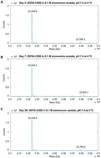 Mass spectra of light chain p-SCN-Bn-DOTA-C595 conjugate stored in 0.1 M ammonium acetate (pH 7.4) at 4 °C at (A) day 0, (B) day 7 and (C) day 30.