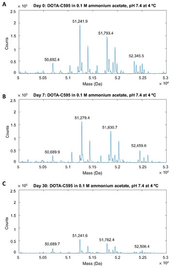 Mass spectra of heavy chain p-SCN-Bn-DOTA-C595 conjugate stored in 0.1 M ammonium acetate (pH 7.4) at 4 °C at (A) day 0, (B) day 7 and (C) day 30.
