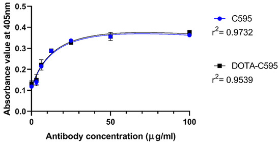 The protein concentration of DOTA-C595 conjugate was quantified using Pierce™ BCA Protein Assay Kit (Thermo Fisher Scientific, Waltham, MA, USA) following manufacturer’s instructions. A spectroscopic Cu(II)-Arsenazo(III) assay was performed to quantify the number of p-SCN-Bn-DOTA groups in the conjugate [29]. Briefly, p-SCN-Bn-DOTA stock was diluted to 3 mM in milli-Q water. In triplicate, the 3 mM DOTA stock (10 µL) was serially diluted in 10 µL of milli-Q water in a 96-well plate to produce a standard DOTA curve. Triplicate samples of the purified immunoconjugate (10 µL) were added to separate wells in the well-plate. 1× Cu(II)-Arsenazo(III) solution (190 µL) was added to each well and the well-plate was incubated for 30 min at 37 °C. The absorbance at 630 nm was measured using a FLUOstar Omega (BMG Labtech, Ortenberg, Germany) plate reader. The concentration of p-SCN-Bn-DOTA in the immunoconjugate was calculated using the standard DOTA curve (Supplementary Figure S1). The molar ratio between the DOTA and C595 protein concentrations in the immunoconjugate was then established.