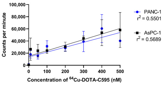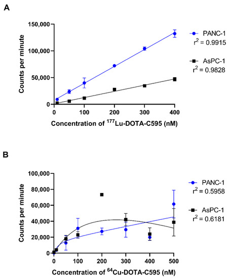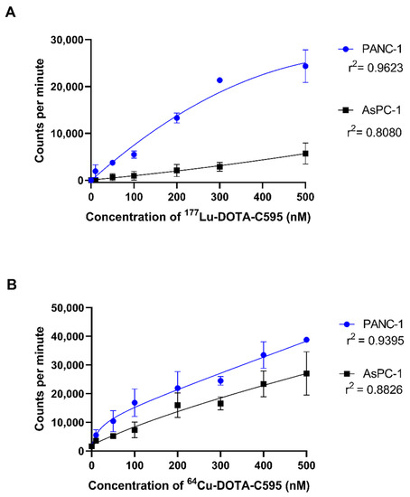 To evaluate the binding capacity of the radioimmunoconjugates to MUC1-CE, separate cell binding assays were performed using 177Lu-DOTA-C595 and 64Cu-DOTA-C595. Our previous work has identified that 93.1% of PANC-1 cells express MUC1-CE compared to only 11.5% of AsPC-1 cells (Supplementary Figure S2) [22]. Due to the variable MUC1-CE expression, these cell lines were used to evaluate for binding differences relative to MUC1-CE expression. Briefly, PANC-1 and AsPC-1 cells (105 cells suspended in 250 µL of media) were seeded into 24-well plates and incubated for 48 h at 37 °C. Varying concentrations of radioimmunoconjugate (0–500 nM) were added to the cells in triplicate and incubated for 1 h at 37 °C. Following incubation, excess media and unbound radioimmunoconjugate were removed from the wells. Cells were washed twice using PBS then detached using TrypLE™ Select Enzyme (1X). The cell lysates were collected and the counts per minute (CPM) of each cell sample was measured using a Hidex Automatic Gamma Counter (Hidex, Turku, Finland). Outliers were removed and background-corrected total cell binding in CPM was plotted against radioimmunoconjugate concentration. The graph was fitted with non-linear least squares regression. Nonspecific binding was considered as proportional to the radioimmunoconjugate concentration.