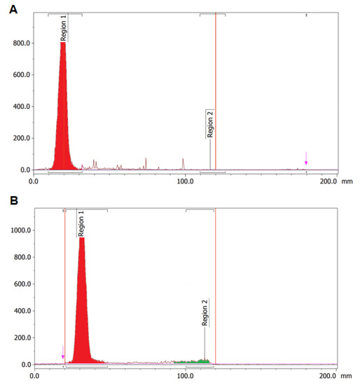 (A) HPLC radio-chromatogram of 64Cu-DOTA-C595. Region 1 (red) represents 64Cu-DOTA-C595 and (B) ITLC radio-chromatogram of 177Lu-DOTA-C595. Region 1 (red) represents 177Lu-DOTA-C595. Region 2 (green) represents free 177Lu.
