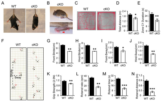 Thorase cKO mice exhibit behavioral deficits. (A) Thorase cKO mice show tremor and limb-clasping reflexes in the tail suspension test. (B) Thorase cKO mice at the age of 6 months walk on their tiptoes (red arrow). (C) Representative image showing tracks of Thorase cKO (n = 13) and WT littermate mice (n = 15) at the age of 5–6 months in open field tests. (D,E) Assessment of the total travel distance (D) and the time spent in the center (C1) (E) during open field tests. (F) Typical front (red) and hind (black) paw footprints of Thorase cKO (n = 5) and WT littermate mice (n = 4) at the age of 5–6 months. (G–J) Quantification of the stride length and sway distance as assessed by front stride length (G), hind stride length (H), front sway length (I), and hind sway length at the age of 5–6 months (J). (K) Assessment of the grip strength performance. (L–N) Motor coordination was assessed by the rotarod rate (L), the retention time on the rotarod (M), and the rotarod distance (N) for Thorase cKO (n = 13) and WT littermate mice (n = 15) at the age of 5 months. Data are presented as the mean ± SEM determined by unpaired two-tailed Student’s t-test. * p < 0.05, ** p < 0.01 and *** p < 0.001.