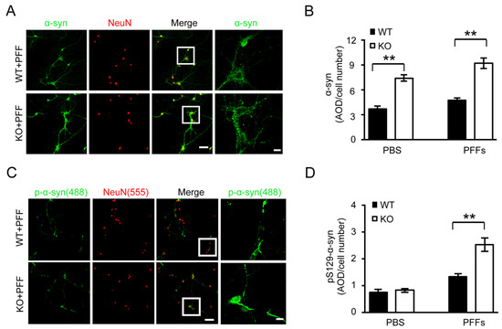 α-Syn PFFs were generated from recombinant mutant A53T α-syn, as described previously [15]. The hA53T-PFFs were diluted in PBS at 0.1 mg/mL, sonicated with 30 pulses at 10% power and added to neuronal media with 5 μg/mL of hA53T PFFs in a 24-well tray [5,6,16]. On DIV 7, neurons were co-cultured with PFFs for 48 h before the removal of culture supernatant and incubation with 500 μL of 4% paraformaldehyde at room temperature (RT) for 15 min. After washing three times with PBS for 5 min, the coverslips were permeabilized with 0.1% Triton X-100 at RT for 20 min and then blocked with 5% BSA in PBS for 2 h.