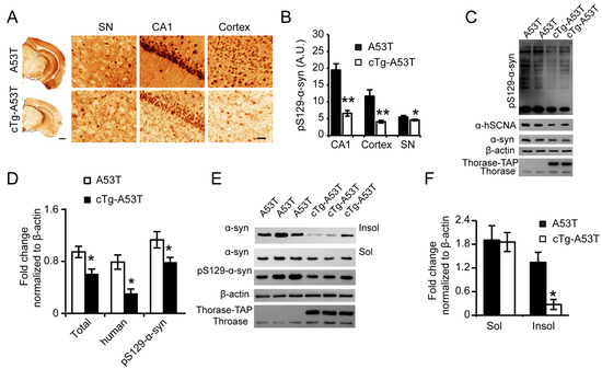 To validate whether Thorase overexpression attenuates α-syn accumulation in vivo, A53T transgenic mice were crossed with inducible tetO-Thorase transgenic (cTg) mice to overexpress Thorase in the forebrains [6]. Immunohistochemical staining of brains from 9-month-old mice showed that pS129-α-syn accumulation was significantly lower in Thorase cTg-A53T mice than A53T mice (Figure 6A,B). Western blot analyses also showed that hSCNA and pS129-α-syn accumulation was significantly reduced in Thorase cTg-A53T mouse brain lysates compared to that in A53T mouse brain lysates (Figure 6C,D). We also discovered that Thorase overexpression significantly prevented the accumulation of the PD-associated insoluble α-syn and pS129-α-syn fractions; soluble α-syn levels dropped only slightly but showed no significant differences (Figure 6E,F). Together, these findings reveal that Thorase overexpression attenuates α-syn accumulation in vivo.