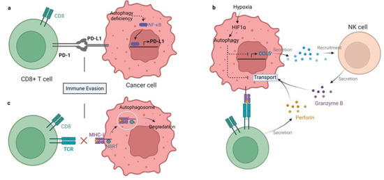 Mechanisms of autophagy-mediated immune evasion. (a) Autophagy deficiency in gastric cancer enhances PD-L1 expression by activating NF-κB, therefore promoting PD1/PD-L1-induced immune evasion. (b) Hypoxia-induced autophagy impairs killing of breast cancer by degrading NK and CD8+ T cell-derived granzyme B in autophagosomes. In addition, autophagy inhibits chemokine CCL5 production. As a result, the recruitment of NK cells to the TME is blocked. (c) MHC-I is recognized by NBR1 and degraded in lysosomes by autophagy in pancreatic cancer cells, which impairs antigen presentation and tumor killing by T cells.