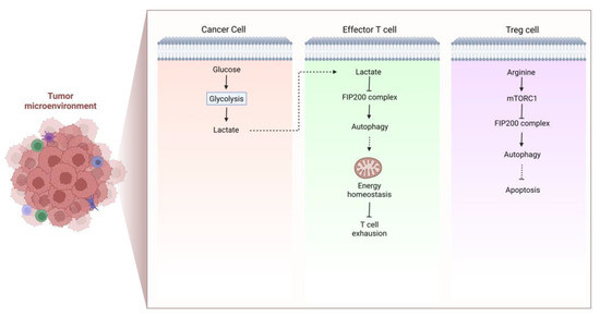 Autophagy plays a vital role in the survival and proliferation of T cells. In TME of tumor-bearing mice and cancer patients, T cells undergo apoptosis. Xia et al. found that tumor-infiltrating T cells exhibit defective autophagy and a decreased level of FIP200, which is necessary for autophagosome formation. This process is mediated by tumor-derived lactate, which lowers FIP200 expression and causes T cell death by disrupting the balance between pro- and anti-apoptotic factors in the Bcl-2 family to boost immune evasion of cancer [66] (Figure 2). The interactions of T cell receptor (TCR) with stromal cells and IL-7 signaling are essential for naive T cells to survive in the periphery, and it appears that Atg3-dependent autophagy is intrinsically required for these processes [67]. Atg7-deficient T cells have poor proliferative capacity and cannot enter the S phase when TCR is activated. Mechanistically, this is attributed to the accumulation of CDKN1B, which cannot be degraded in autophagy-deficient naive T cells, and negatively regulates cell cycle [68]. Defective autophagy can also disturb T cell activation, differentiation, and stemness. It has been reported that the differentiation from T cells to invariant natural killer T (iNKT) and Treg is facilitated by autophagy [69]. Yang et al. found that deletion of autophagy-related protein PIK3C3/VPS34 reduced the activity of mitochondria upon T cell activation, so that CD4+ T cells failed to differentiate into T helper 1 cells [70]. Similarly, the quality of mitochondria declines when the mitochondrial components cannot be degraded adequately, resulting in ROS accumulation and T cell damage [71]. Depolarized mitochondria were also detected in IL-15-induced resident memory CD8+ T cells with autophagy inhibited by MRT68921 dihydrochloride and 3-methyladenine (3MA), causing T cells exhaustion [72]. CD4+ Treg cells in TME confer another primary mechanism of immune evasion and immunotherapy resistance. Autophagy was shown to participate in maintaining Treg cell function [73]. Inhibition of autophagy by Atg5, Atg7 and AMBRA1 deletion induces Treg cell apoptosis and dysfunction in vivo [74,75,76] (Figure 2).
