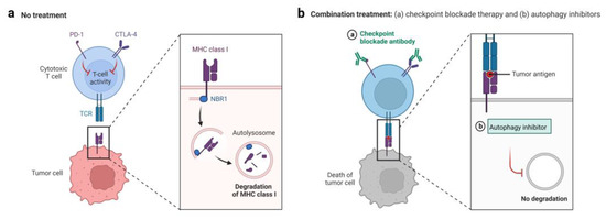 The role of autophagy in immune system activation and immunosuppressive TME formation is complex. On the one hand, autophagy may participate in the process of antigen presentation by APCs through proteasome degradation and the vacuolar pathway [46]. Autophagic degradation can promote APC efficiency by accelerating antigen processing [47]. Autophagy deficiency in pancreatic ductal adenocarcinoma stimulates PD-L1 expression, which may aid in the formation of immunosuppressive TME [48]. Similarly, autophagy inhibition can upregulate PD-L1 expression by accumulating p62/SQSTM1 and activating NF-κB in gastric cancer [49] (Figure 1a). Autophagy contributes to immune evasion by suppressing the innate and adaptive immune response. The inducers of the innate immune response, such as damaged proteins, organelles, and bacteria, are cleared by autophagy. DAMPs and pathogen-associated molecular patterns (PAMPs) are both inducers of innate immunity, which can be captured and degraded in autolysosomes [50]. These facts indicate that autophagy seems to be a key negative regulator of innate immune responses when activated [51]. As a consequence, inhibition of autophagy facilitates the production and secretion of proinflammatory cytokines such as IFNs (type I, II) and TNF-α in vitro and in vivo [52]. Inhibition of autophagy can also trigger programmed cell death of cancer cells, producing DAMPs to activate the adaptive immune system [53]. Moreover, autophagy can suppress the adaptive immune response by weakening T cells’ ability to kill tumor cells [54]. It has been shown that antigenic tumors are recognized and eliminated by T cells when autophagy is inhibited in mice [55]. There are several mechanisms by which autophagy restrains the antitumor T cell response. Autophagy suppresses the functions of NK cells, CD4+ T cells, and CD8+ T cells to help tumor cells combat immunosurveillance, acting as a protective mechanism in tumors [56]. For example, hypoxia-induced autophagy can impair NK cell-mediated killing of breast cancer cells by degrading NK-derived granzyme B in autophagosomes [57] (Figure 1b). Hypoxia-induced autophagy is also reported to attenuate cancer cell sensitivity to CTL by regulating the STAT3 pathway in IGR-Heu lung carcinoma cells [58]. Hence, autophagy in tumors may be a potential target to block immune evasion in the TME. Meanwhile, the initiation of immune response often needs a major histocompatibility complex (MHC) to present antigens to T cells. MHC includes class I and II, that are recognized by CD4+ and CD8+ T cells, respectively [59]. MHC-I presents peptides that prime and activate CD8+ CTLs. Then, CTLs clear the targeted tumor cells by detecting a matching antigen by the MHC-I [60]. The expression of MHC-I is downregulated in pancreatic cancer, resulting in defective antigen presentation, which limits the ability of tumor killing by T cells and immunotherapy. Mechanistically, MHC-I is recognized by NBR1 and degraded in lysosomes through autophagy [55] (Figure 1c). Additionally, in dendritic cells (DCs), autophagy has been shown to accelerate the internalization and degradation of MHC-I. DCs with autophagy inhibition enhance the presentation of viral antigens to CD8+ T cells [61,62]. Recently, hepatic autophagy immune tolerance (HAIT) has been studies and is regarded as another immune evasion mechanism. A study by Laura et al. revealed that autophagy in the liver induces tumor immune tolerance by promoting Treg function and inhibiting T-cell response and interferon-γ production, resulting in the growth of tumors with high tumor mutational burden (TMB). Therefore, autophagy may be a potential target to overcome HAIT [52].