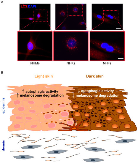 - Kim, J.Y.; Kim, J.; Ahn, Y.; Lee, E.J.; Hwang, S.; Almurayshid, A.; Park, K.; Chung, H.J.; Kim, H.J.; Lee, S.H.; et al. Autophagy induction can regulate skin pigmentation by causing melanosome degradation in keratinocytes and melanocytes. Pigment. Cell Melanoma Res. 2020, 33, 403–415. [Google Scholar] [CrossRef]