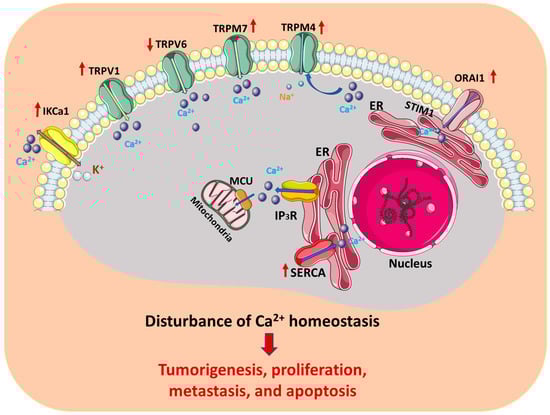 In addition to the Ca2+ channels, pumps, and interacting proteins and ligands mentioned above, there are still many Ca2+-regulatory factors that regulate Ca2+ homeostasis and signal transduction related to the occurrence of cancer in vivo. For example, studies have shown that Orai3 is involved in various processes of breast cancer, such as proliferation and survival and resistance to chemotherapy, and the expressions of secretory pathway Ca2+-ATPases (SPCA1) and SPCA2 genes are significantly increased in breast cancer [,]. The plasma membrane Ca2+-ATPase (PMCA) is ubiquitously expressed, which is critical for maintaining low resting cytosolic Ca2+ in cells. Studies spanning many years have revealed that some cancers are associated with a remodeling of PMCA expression []. The sodium/calcium exchanger (NCX) and the therapeutic potential of its inhibitors have been also studied in cancer []. Piezo1, a mechanically activated ion channel, can regulate Ca2+-dependent signaling cascades associated with tumor cell migration by promoting local Ca2+ influx []. Piezo1 is involved in colon cancer cell metastasis; its expression is significantly elevated in prostate cancer cell lines and human prostate cancer tissues, and downregulation of Piezo1 significantly inhibits prostate cancer cell survival, proliferation, and migration [,]. In addition, some studies have also found that the multidrug resistance of cancer cells can be overcome by regulating the T-type Ca2+ channel [].
