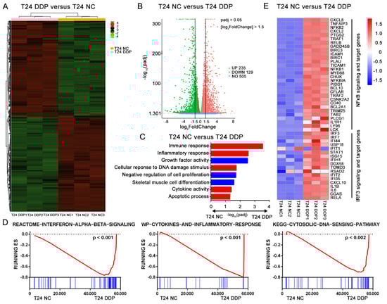 Cisplatin induces specific immune effects in bladder cancer cell line. T24 cell lines were treated with 2 μg/mL cisplatin (T24 DDP group) or PBS (T24 PBS group) for 24 h at standard condition. (A) The different genes expression panels between T24 DDP group and T24 PBS group were showed in heatmap. (B) Gene expression levels were quantified as Fragments Per Kilobase Million (FPKM) and then Log2–transformed as A value. The significant different expression genes were identified as absolute fold change of A value > 1.5 and Padj (adjust p) value < 0.05 between two groups. Finally, the volcano map showed 235 up genes and 129 down genes with significant difference. (C) Go pathways with Padj value < 0.05 were showed here between T24 DDP group and T24 PBS group. (D) Gene set enrichment analysis (GSEA) in: Interferon α, β signaling (p < 0.001), cytokines and inflammatory response (p < 0.001) and cytosolic DNA sensing pathway (p < 0.002). (E) Relative transcription levels of genes expression involved in IRF3 and NF-κB signal pathway or targeting genes in T24 DDP group and T24 PBS group. Gene expressions were normalized by R software from −1.5 to 1.5 (Low to high, blue to red).