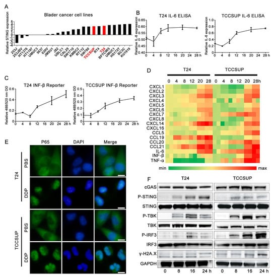 Immune effect of cisplatin in bladder cancer is related to the activation of cGASSTING pathway. (A) Basic transcription levels of STING in bladder cancer cell line on CCLE database. (B–D) T24 and TCCSUP cell lines were treated with 2 μg/mL cisplatin for 0 h (control group), 4 h, 8 h, 12 h, 20 h, 28 h at standard condition, respectively. (B) ELISA analysis of IL-6 secretion in supernatants in cisplatin treated T24 and TCCSUP cell lines and corresponding control groups for different time points. (C) IFN Bio-assay in cisplatin treated T24 and TCCSUP cell lines and corresponding control groups for different time points. (D) qRT-PCR analysis of cytokines and chemokines expression in cisplatin treated T24 and TCCSUP cell lines and corresponding control groups for different time points. Shown are genes induced at least two repeats. (E) Immunofluorescence assay showed subcellular distribution of p65 in T24 and TCCSUP cell lines treated with 2 μg/mL cisplatin or PBS for 24 h. Scale bar represent 5 μm. (F) Western blotting results of key proteins involved in cGAS-STING pathway in T24 and TCCSUP cell lines treated with 2 μg/mL cisplatin for 0 h, 4 h, 8 h, 12 h, 24 h, respectively. GAPDH was used as control protein.