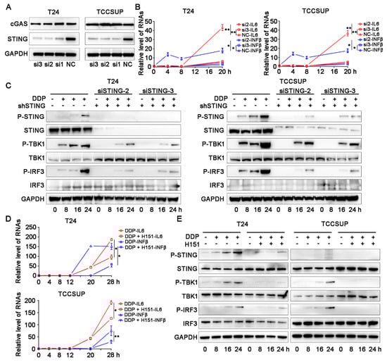 Expression of the STING protein is the basic element for the functional STING pathway. We first explored the basic transcription level of STING in bladder cancer cell lines in the CCLE database (https://portals.broadinstitute.org/ccle/about/, accessed on 11 October 2020) and found that the transcription level of STING was relatively abundant in bladder cancer, including T24 and another MIBC cell line TCCSUP (Figure 2A). ELISA and IFN-β reporter gene assays showed that the levels of IL-6 and IFN-β, which are activated downstream of the STING pathway, were significantly upregulated with cisplatin treatment in the T24 and TCCSUP cells (Figure 2B,C). qPCR confirmed that the transcription levels of cytokines, including IL-6, IFN-β, and TNF-α, were significantly upregulated after cisplatin treatment (Figure 2D). We also observed the translocation of p65 from the cytoplasm to the nucleus (Figure 2E). The canonical activation of the STING pathway is mainly based on the phosphorylation of STING (Ser366), TBK (Ser173), and IRF3 (Ser396) [25,26,27,28]. We then performed western blotting assays and found that cisplatin treatment significantly upregulated the cGAS-STING pathway accompanied by a significant increase in the DNA damage marker γ-H2A.X in the two cell lines compared with their corresponding control groups (Figure 2F). In the rescue assay, the use of two STING-targeting siRNAs (Figure 3A–C) and the STING-specific inhibitor H151 (Figure 3D,E) significantly reversed cisplatin-induced IL-6 and IFN-β levels compared with their control groups. H151 specifically targets the transmembrane cysteine residue 91 of STING and thereby blocks its palmitoylation which is indispensable for the recruitment of downstream signaling factors [29]. These results suggested that the cGAS-STING pathway was deeply involved in the cisplatin-related immune response.
