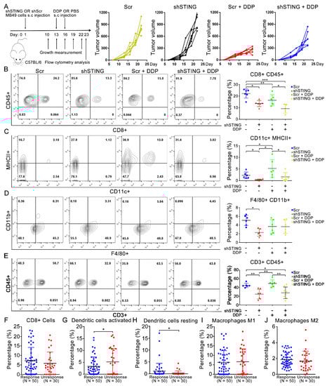 To explore whether the difference in MB49-derived tumors is related to immunity, we analyzed tumor-associated infiltrating immune cells by flow cytometry. With cisplatin treatment, we found that compared with the STING knockdown group, the percentage of CD8+ CD45+ CD11c+ MHCII+ (dendritic cells, DCs), and CD3+ CD45+ cells were significantly higher in the STING WT group (Figure 4B,C,E) while the percentage of F4/80+, CD11b+ (macrophage) infiltration was not significantly different (Figure 4D). Compared with the control group, the percentage of CD8+ CD45+, CD3+ CD45+, and F4/80+ CD11b+ cells in the cisplatin-treated groups decreased significantly while the percentage of CD11c+ MHCII+ infiltrating cells was significantly increased. We also used CIBERSORT (https://cibersort.stanford.edu/, accessed on 5 November 2020) [30] to analyze the percentage of immune cell infiltration in bladder cancer patients who received preoperative cisplatin chemotherapy in the TCGA bladder cancer cohort (Figure 4F–J). Consistent with our vivo experimental results, the resting dendritic cells infiltrated in the cisplatin-responsive group (n = 50, CR or PR) was significantly higher than that in the non-responder group (n = 30, PD or SD), while the infiltration of activated dendritic cells showed the opposite result. Studies have reported that CCL20 and CXCL14 are important chemokines in DC cells. We found that the transcription levels of CCL20 and CXCL14 in T24 and TCCSUP cells were significantly increased in the cisplatin treatment groups (Figure S2D,E), and the correlation analysis showed that CCL20 and CXCL14 were significantly correlated with the cGAS-STING signal in the TCGA bladder cancer cohort (Figure S2F). This finding implies that DCs play a unique role in the bladder cancer microenvironment after cisplatin treatment [31]. However, the specific function of cisplatin-induced DCs in the bladder cancer microenvironment needs to be further explored.