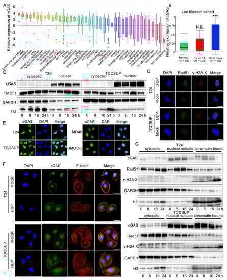 As an important protein that can recognize dsDNA and catalyze the production of 2,3-cGAMPs, the expression of the cGAS protein is the most important upstream of STING activation. We then explored the basic transcription level of cGAS in bladder cancer cell lines in the CCLE database (https://portals.broadinstitute.org/ccle/about, accessed on 11 October 2020) and confirmed the high transcription level of cGAS in bladder cancer cell lines (Figure 5A, rank 11th among 40 tumor types). T24 and TCCSUP also showed relatively high transcription levels of cGAS (Figure S2G), and we also noted that MIBC cells had significantly increased cGAS expression levels in the Oncoming Database (Figure 5B). Cisplatin has been reported to induce dsDNA fragments through the accumulation of DNA damage and inhibition of the DNA homologous complementary repair pathway [17]. We observed a significant increase in the DNA damage marker γ-H2A.X in T24 and TCCSUP cell lines treated with cisplatin (Figure 2F). Rad51 is an important protein involved in homologous complementary repair of DNA, and the upregulation and assembly of nuclear Rad51 is also the classical marker of increased DNA damage [32]. We found that nuclear Rad51 increased and was significantly accumulated after cisplatin stimulation while the cytosolic Rad51 levels were not changed (Figure 5C,D). When dsDNA induced by DNA damage leaks into the cytoplasm, histone H3 bound to dsDNA will be brought into the cytoplasm at the same time, resulting in an increased level of cytosolic H3 protein [33]. Consistent with our results, we observed that the level of H3 in the cytoplasm increased significantly as the time of cisplatin stimulation increased (Figure 5C), which also suggested that dsDNA might leak from the nucleus continuously after cisplatin treatment. Furthermore, we found that cisplatin also induced micronuclei in the T24 and TCCSUP cell lines (Figure S2H). These are important factors that activate the cGAS-STING pathway.