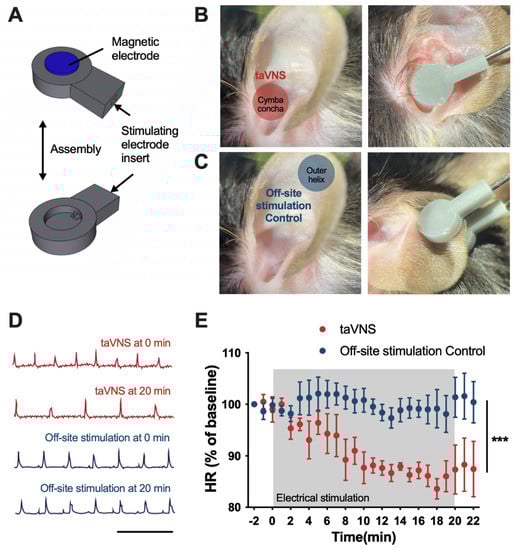 Novel device for auricular vagus nerve stimulation and modulatory effects on heart rates. (A) Three-dimensional modeling of stimulation devices. (B,C) Three-dimensionally printed prototype device applied to the cymba concha (taVNS) and outer helix (off-site stimulation control). (D) Representative ECG trace showing the declined heart rate in a model mouse, corresponding to prolongation of the R-R interval during taVNS. Scale bar 500 ms. (E) taVNS suppressed heart rate; however, there were no changes in the off-site stimulation control group (taVNS, n = 5; off-site stimulation control, n = 6; p < 0.001). The error bars indicate the SEM. Two-way repeated measures ANOVA was used. *** p < 0.001.