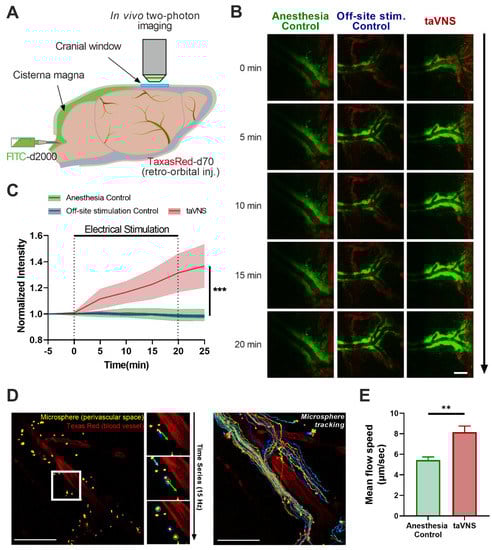 To visualize the CSF flow, 10 μL of FITC-d2000 (MW 2000 kD, Invitrogen, Waltham, WA, USA) dissolved in aCSF at a concentration of 0.5% was injected at a rate of 2 μL/min over 5 min with a syringe pump. For microsphere imaging, 10 μL of yellow-green polystyrene microspheres (FluoSpheres™ 1.0 µm, Invitrogen) dissolved in aCSF at a concentration of 0.5% was injected in the same manner. Then, 20 min of taVNS was applied before microsphere injection. A 0.1 mL bolus of 5% (w/v) Texas Red dextran (MW 70 kD, Invitrogen) in PBS was injected retro-orbitally for visualization of the cerebral vasculatures [35].