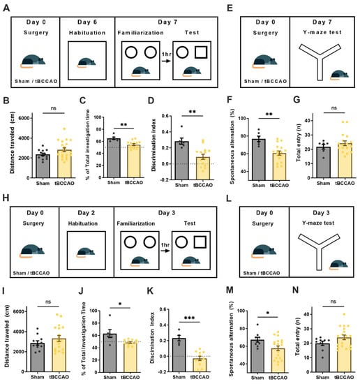 To investigate VCI, a tBCCAO animal model of stroke was used. tBCCAO is a well-established experimental method that induces diffuse brain ischemic damage, resulting in cognitive impairment without motor deficits [28,40,41]. First, we validated whether cognitive impairment was induced by tBCCAO. The NOR and Y-maze tests were conducted 7 days after surgery (Figure 3A). There were no differences between groups in the total distance moved during the habituation period of the NOR test (Figure 3B). The percentages of total investigation time and the discrimination index scores evaluated by the NOR test were significantly lower in the tBCCAO groups compared to the sham group (Figure 3C,D). In the Y-maze test (Figure 3E), the tBCCAO groups showed significantly lower levels of spontaneous alternation than the sham group (Figure 3F). There was no difference in total arm entry, indicating that locomotion was intact after tBCCAO (Figure 3G). We then performed behavioral experiments in a new subset of animals 3 days after tBCCAO surgery (Figure 3H,I) and confirmed that the tBCCAO-induced cognitive impairment symptoms manifested during this early period (Figure 3J–N). Overall, these data indicate that tBCCAO caused cognitive impairment without affecting motor function, and the symptoms developed and persisted for at least 3~7 postoperative days.