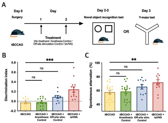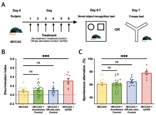 Next, we evaluated the effects of taVNS on cognitive impairment induced by tBCCAO. Animals were randomly divided into three groups after stroke induction with tBCCAO: anesthesia control, off-site stimulation-control, and taVNS groups. Animals were subjected to each treatment for 6 days followed by the NOR and Y-maze tests on the seventh day (Figure 4A). Data from each group were compared to the data from the untreated tBCCAO group shown in Figure 3D,F. taVNS significantly ameliorated the discrimination index scores determined by the NOR test (Figure 4B) and the rates of spontaneous alternations in the Y-maze test (Figure 4C).