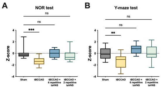To compare the size of the effect, the data measured on postoperative days 3 and 7 were pooled for each sham or tBCCAO group. Then, all behavioral data from each group were normalized by calculating the Z-score using the average value and standard deviation of the pooled sham group. Thus, the Z-score in this analysis indicates the relative cognitive function of the subjects in each group compared to the levels of normal subjects in the sham group. The tBCCAO group showed significantly lower levels of cognitive function than the sham group. The tBCCAO-induced impairment of cognitive function was significantly improved by either six or two repetitive taVNS treatments (Figure 6A,B). The degree of improvement was comparable between the two groups with six or two repetitive taVNS treatments. In addition, the data from the tBCCAO animals treated with taVNS were not significantly different from those of the animals subjected to the sham surgery. This indicates that the effect of either six or two repetitive taVNS treatments was sufficient to cancel out the tBCCAO-induced impairment of cognitive function.