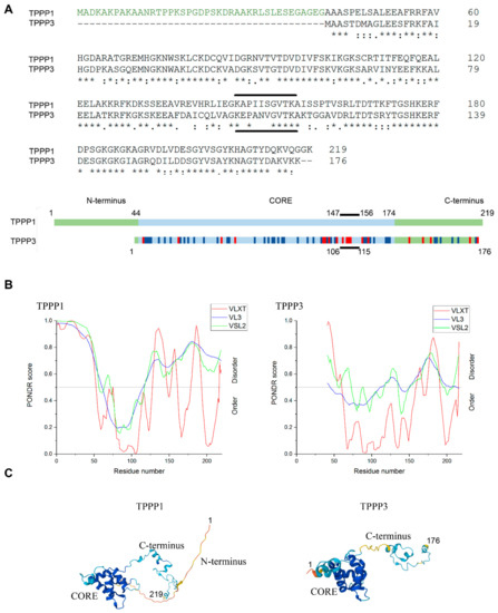 Sequences of human TPPP1 (UniProtKB O94811) and TPPP3 (UniProtKB Q9BW30) were submitted to the PONDR server (http://www.pondr.com) (accessed on 25 April 2022) using three different algorithms, namely VLXT, VL3 and VSL2 [36,37]. Access to PONDR was provided by Molecular Kinetics (IUETC, Indianapolis, IN, USA; e-mail: main@molecularkinetics.com) under the license from the WSU Research Foundation.
