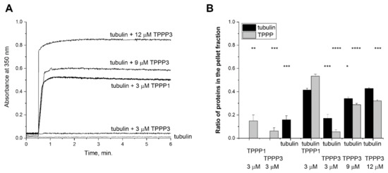 Interaction of TPPP3 and TPPP1 with tubulin. (A) TPPPs-induced tubulin polymerization was measured by turbidimetry; 3 μM TPPP1 or 3, 9 or 12 μM TPPP3 was added to 6 μM tubulin. A representative experiment is shown. (B) The extent of the polymerization was quantified by pelleting experiments following the centrifugation of the samples (17,000 g, 10 min, 37 °C); the pellet (P) and supernatant (S) fractions were loaded to 13.5% SDS-PAGE and the partition of the proteins in the pellet (P) fraction was quantified by densitometric analysis. Statistical comparisons were performed with two-sided, unpaired Student’s t-test, as compared to the control (tubulin + 3 μM TPPP1) (* p < 0.05, ** p < 0.01, *** p < 0.001 and **** p < 0.0001).