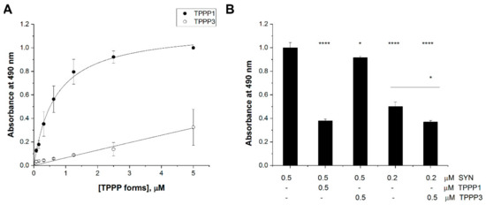 Interaction of TPPP3 with SYN compared to that of TPPP1. (A) In an ELISA experiment, the plate was coated with SYN, then human recombinant TPPP1 (●) or TPPP3 (○) was added at different concentrations and the bound proteins were detected by specific antibodies. The binding affinities were evaluated by curve fitting, assuming simple hyperbolic saturation: 673 ± 58 nM for TPPP1. (B) In the competitive ELISA experiments, SYN alone or with TPPP3 was added to the immobilized TPPP1 and the binding of SYN was quantified by SYN antibodies. The normalized results are presented as means ± of the standard deviation (SD). Statistical comparisons were performed with two-sided, unpaired Student’s t-test, as compared to the control or as the lines indicate (* p < 0.05 and **** p < 0.0001).