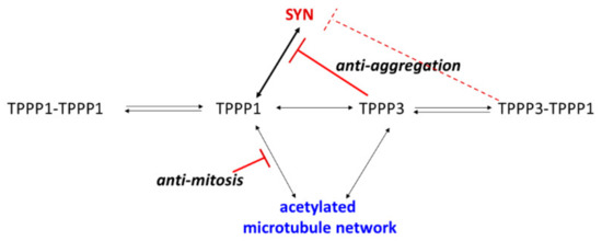 We have identified unexpected characteristics of the homologous TPPP3. While the two TPPP proteins display similar binding and functional activities as MAPs, the key difference in their properties is their affinities to the brain-specific SYN, the aggregation of which is extensively promoted by TPPP1, which can exclude the extensive division of the cells (Figure 10). This plausible notion seems to be supported by clinical observation, namely that PD patients have a reduced risk for cancer [57,58].
