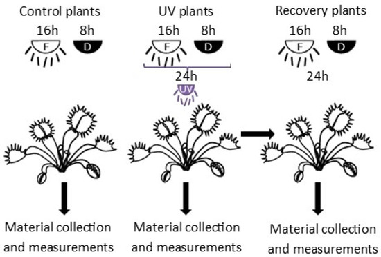 In vitro plants were transplanted to pots with sand and peat in a 1:1 ratio. Plants were acclimated in Sanyo Environmental Test Chamber MLR-351H at 23 ± 1 °C, under 16/8 h light photoperiod of 100 μmol·m−2·s−1 PPFD and air humidity of 90%. Humidity was reduced every 4 days by 10% until it reached a value of 50%. After two weeks, the light intensity in the chamber was increased to 170 μmol·m−2·s−1 PPFD. After four weeks, plants were placed in a growing chamber at 23 ± 1 °C, under 16/8 h light photoperiod of 290 μmol·m−2 s−1 PPFD, and air humidity of 30–40% and acclimated for one week. After acclimatization, plants were treated with UV-A radiation of 50 μmol·m−2·s−1 PPFD for 24 h. During the light period (16 h), fluorescent light was supplemented with UV-A radiation. Other conditions were the same as described for the last week of acclimatization in the growing chamber. Control plants were grown in the same conditions excluding UV-A radiation. Plants were watered with distilled water every day during acclimatization and the experiment. Chlorophyll a fluorescence and gas-exchange measurements were conducted on plant leaves immediately after the termination of the 24 h exposure to UV-A treatment, both in control plants and UV-A-treated plants, refered to as UV plants in the following. Additionally, measurements were taken in UV-A-treated plants after 24 h after the termination of the 24 h exposure to UV-A, the so-called recovery plants (Figure 1). Plant material for the other analyses was also collected on the same dates. Leaves (without trap part) were collected and freeze-dried for 48 h.