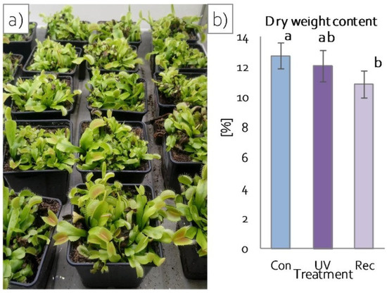 Growth of D. muscipula plants under UV-A treatment: (a) plant morphology; (b) dry weight content; Con—control plants; UV—UV plants; Rec—recovery plants; different letters—statistically significant differences at p ≤ 0.05; n = 5.